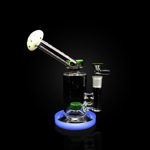 8” ALPHA MUSHROOM SHAPE SIDE MOUTHPIECE SHOWERHEAD PERC TOPPED WITH USA COLOR FIRE SHADES. COLOR BASE RIM WITH AND MATCHING HANDLE BOWLS GREEN APPLE