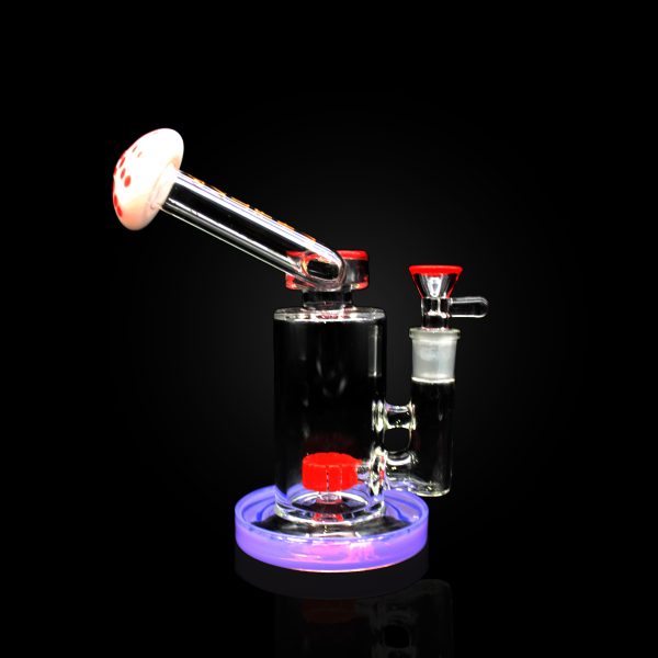 8” ALPHA MUSHROOM SHAPE SIDE MOUTHPIECE SHOWERHEAD PERC TOPPED WITH USA COLOR FIRE SHADES. COLOR BASE RIM WITH AND MATCHING HANDLE BOWLS LIME PURPLE
